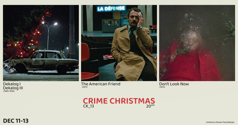 Art Bioskop CK13 vas poziva na ciklus filmova pod nazivom „Crime Christmas“ u okviru kog će biti prikazani filmovi koji tematski nisu standardni Božićni filmovi, ali čija je radnja smeštena u dovoljno hladan ambijent da odgovara prazničnoj, decembarskoj tematici. Bez obzira na to da li je reč o moralnom zločinu kao što je to slučaj kod Kješlovskog, o plaćenom ubistvu kao kod Vendersa, ili o misterioznim i neobjašnjivim dešavanjima u Veneciji-lavirintu kod Rega, ova tri filma i tri kultna reditelja nude alternativne praznične klasike.