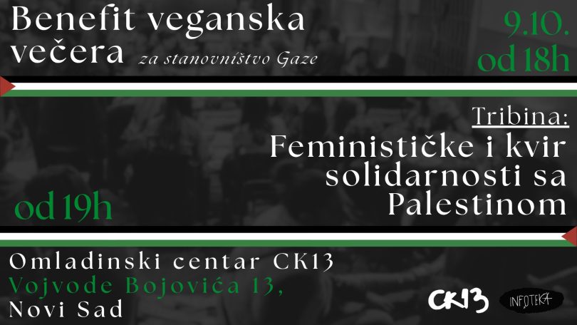 Infoteka CK13 vas poziva na Benefit vegansku večeru za stanovništvo Gaze i tribinu “Feminističke i kvir solidarnosti sa Palestinom”.