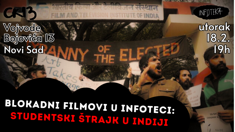 Infoteka CK13 vas poziva na projekciju dokumentarnog filma koji se bavi studentskim blokadama u Indiji, započetim na jednom filmskom institutu nakon što je za upravnika postavljen glumac blizak vladajućoj nacionalističkoj i autokratskoj BJP stranci. Ovaj film obrađuje lična iskustva dvoje studenata koji su učestvovali u blokadi, ilustrujući kroz njihovu priču tok blokada, kao i širi politički i socijalni kontekst u kojim su se one odvijale.