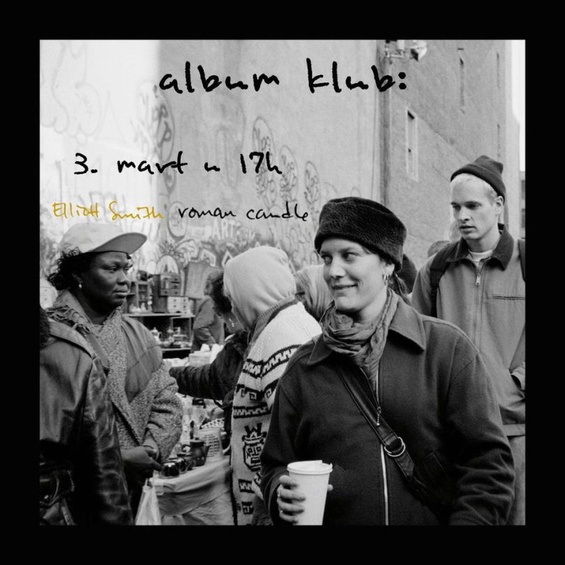 Na novom sastanku album kluba slušamo prvi solo album Eliota Smita – Roman Candle (1994). Iako nije toliko popularan koliko Either/Or ili XO, ovaj lofi album traje svega 30 minuta i slušajući ga vas automatski level up-uje kao Eliot Smit slušaoca. Na ovom albumu uspeva da stvori ukletu atmosferu – kako kroz njegove tihe vokale, tako i kroz skroman odabir instrumenata: akustična gitara kao glavni instrument uz drage momente usne harmonike i povremene “angy” momente električne gitare. Iako nije bio otvoren oko značenja svojih pesama, na albumu su dosta uočljive tematike iz njegovog turbulentnog detinjstva. Gnev, strah i nesigurnost su osećanja koja se prožimaju kroz ceo album. Bežanje od hostilnog očuha, vožnja sa mamom i pažljivo vraćanje nazad kao da se ništa nije dogodilo. Svedoci svađa koji odu svojim kućama, sigurnost koje donosi spavanje i moćne majke čije ruke čuvaju od čudaka.