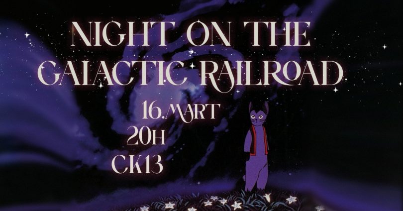 Film je baziran na istoimenom romanu za decu Kenđija Mijazave (Kenjija Miyazaw) koji je napisan oko 1927. i govori o fantastičnom putovanju dva prijatelja, usamljenog dečaka (mačka) Đovanija i Kampanela na takozvanoj „galaktičkoj železnici” gde susreću razne neobične putnike. Ukoliko ste zainteresovani za snoliko putovanje kroz zvezde i nebeske livade koje će vas ostaviti u melanholičnom meditativnom stanju, pridružite nam se na projekciji.