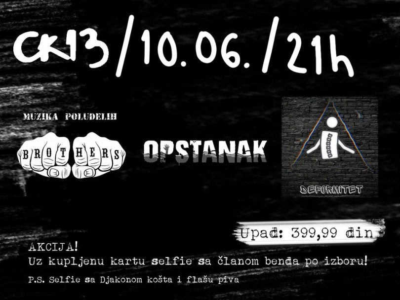 Uz Opstanak, nastupiće i mlade nade – Deformitet iz Selenče, učesnici Bunt rok festivala i pobednici Velikogradištanske gitarijade. Svoj žanr definišu kao mešavina panka, roka i metala, sa mestimičnim repom i ska ritmom. Sastav čine dva pevača Filip Čapanda i Riki Joha, a prateći vokal peva i basista Pavel Pavlinji, a tu su i Danijel Kočonda na bubnju i Martin Švec na gitari.