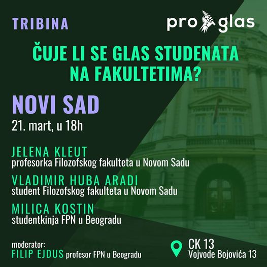 Inicijativa ProGlas vas poziva na tribinu “Čuje li se glas studenata na fakultetima?” u četvrtak, 21. marta sa početkom u 18 časova.